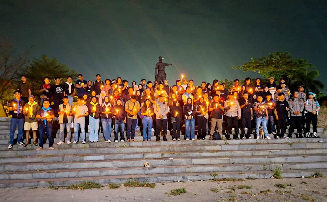 GoTimes.id, Kota Gorontalo – Senja mulai turun di Lapangan Taruna Remaja, Kota Gorontalo. Seiring cahaya matahari yang meredup, ratusan lilin dinyalakan, memancarkan cahaya kecil yang menyatu dalam keheningan. Di antara cahaya itu, para pecinta alam dari berbagai komunitas hadir, berpakaian serba hitam, menundukkan kepala, mendoakan almarhum Muhamad Jeksen.